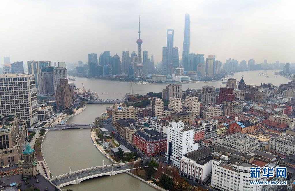 从空中俯瞰苏州河(下)与黄浦江的交汇处(无人机照片,2020年12月29日摄)。新华社记者 方喆 摄