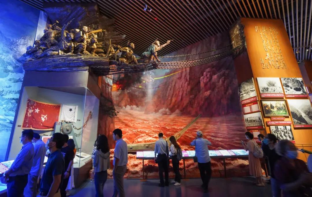 2021年7月15日起,中国共产党历史展览馆正式面向社会公众开放。图为观众在中国共产党历史展览馆“‘不忘初心、牢记使命’中国共产党历史展览”上观看飞夺泸定桥展陈。新华社记者 陈晔华/摄