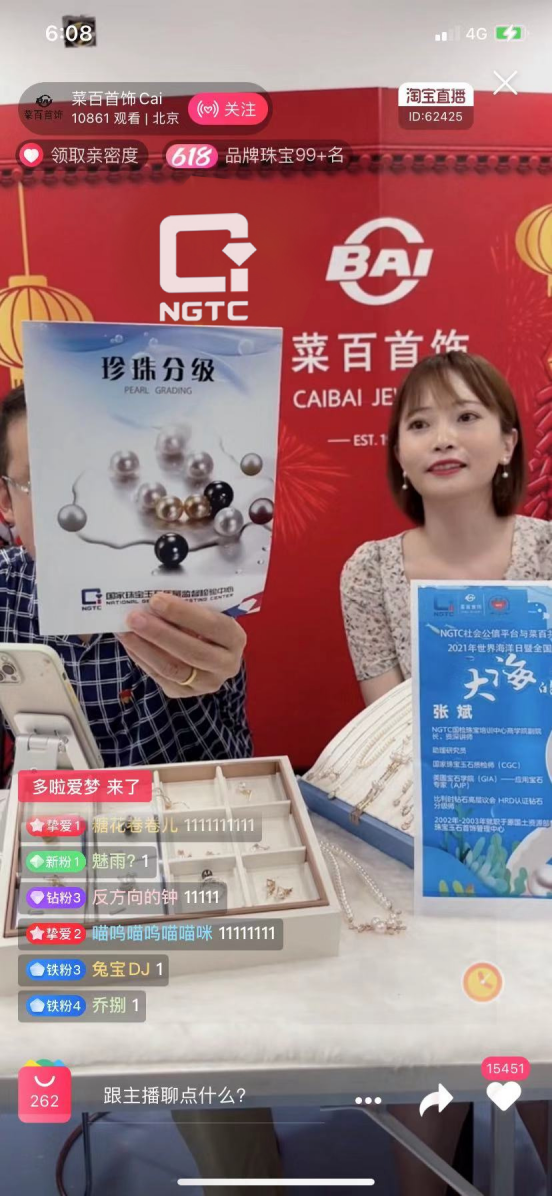 海洋日当天珠宝国检(NGTC)充分发挥自身科学检测及教育培训的专业优势,由珠宝国检(NGTC)教育专家——NGTC国检珠宝培训中心商学院副院长、资深讲师张斌与菜百首饰天猫旗舰店、淘宝店的专业主播一起,通过NGTC+直播间·一直播平台,菜百首饰天猫旗舰店、菜百首饰淘宝直播间,矿业界微信公众号联合直播,为线上观众在线介绍珍珠的品质分级原理及方法,解读珠宝首饰的质量保证——珠宝国检(NGTC)证书,分享选购与保养等科学消费知识。