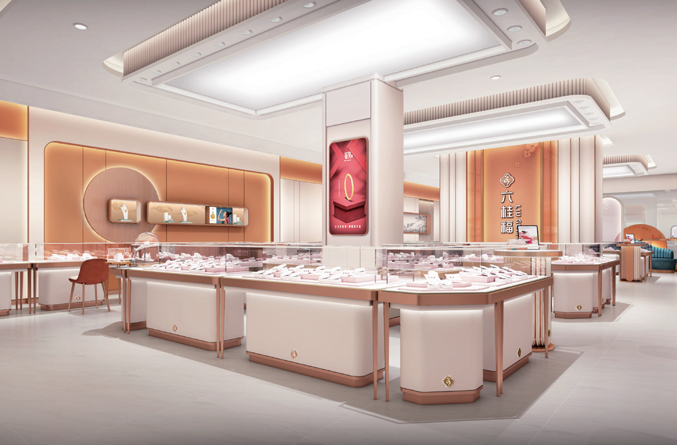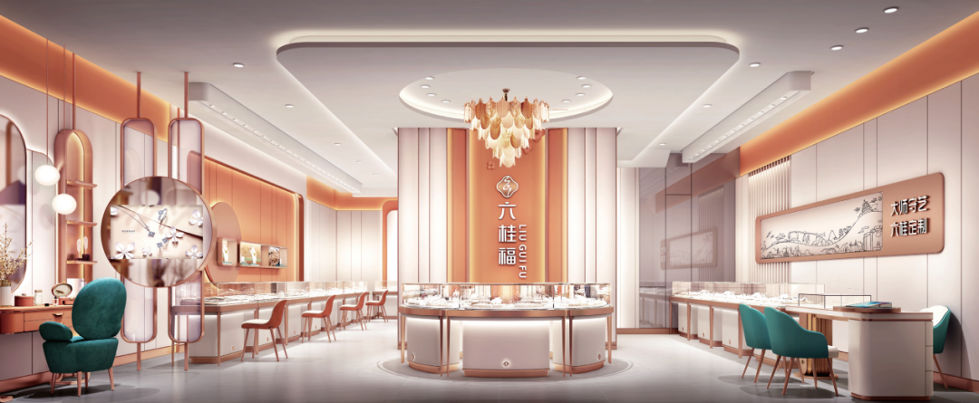 作为积极弘扬东方黄金珠宝文化的品牌之一,六桂福珠宝不断从五千年的中华优秀传统文化中汲取灵感。六桂福珠宝全新终端门店以“新国风”概念融入创意设计,将中华优秀传统文化、现代美学、“桂树”图腾、珠宝肌理、品牌格调与国潮风尚融为一体,营造出富有特色的“五感六觉”终端品牌门店文化氛围?!拔甯小痹谟诰裉逖?,“六觉”在于情景营造,两者相辅相成,共同为消费者带来精神愉悦的沉浸式情景体验。