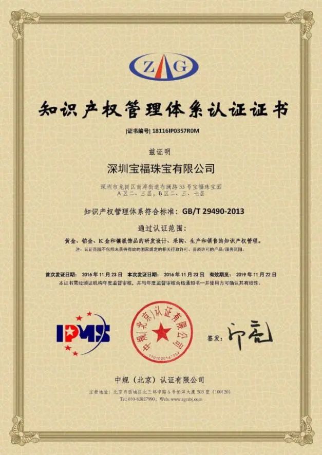 宝福十分注重知识产权体系的建设,不断提升创意设计水平,革新生产工艺,每年投入大量资金用于新产品设计研发,以及国际化先进设备和人才引进,建立起知识产权管理体系。截至目前,宝福拥有注册自主知识产权的24项发明专利、63项实用新型专利、160 多项产品外观设计专利和31项著作权、160多个国内商标,并于马德里、欧盟成员国等城市和国家完成了国际商标注册。2016年,宝福成功通过“知识产权管理体系”认证,成为该领域认证成功的珠宝企业之一,奠定了品牌?;さ闹匾?。由宝福全资建设的宝福李朗珠宝文化产业园多年来致力于园区知识产权体系构建,于2017年荣获深圳市知识产权局认证的“深圳市知识产权孵化基地”。
