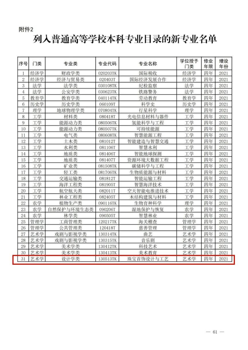 近日,教育部印发《关于公布2021年度普通高等学校本科专业备案和审批结果的通知》,新增1961个专业点、撤销804个专业点。珠宝首饰设计与工艺、碳储科学与工程、空天智能电推进技术、生物育种科学、资源环境大数据工程、湿地?;び牖指?、智慧林业、劳动教育、科学史等31种新专业正式纳入本科专业目录(详见下图)。