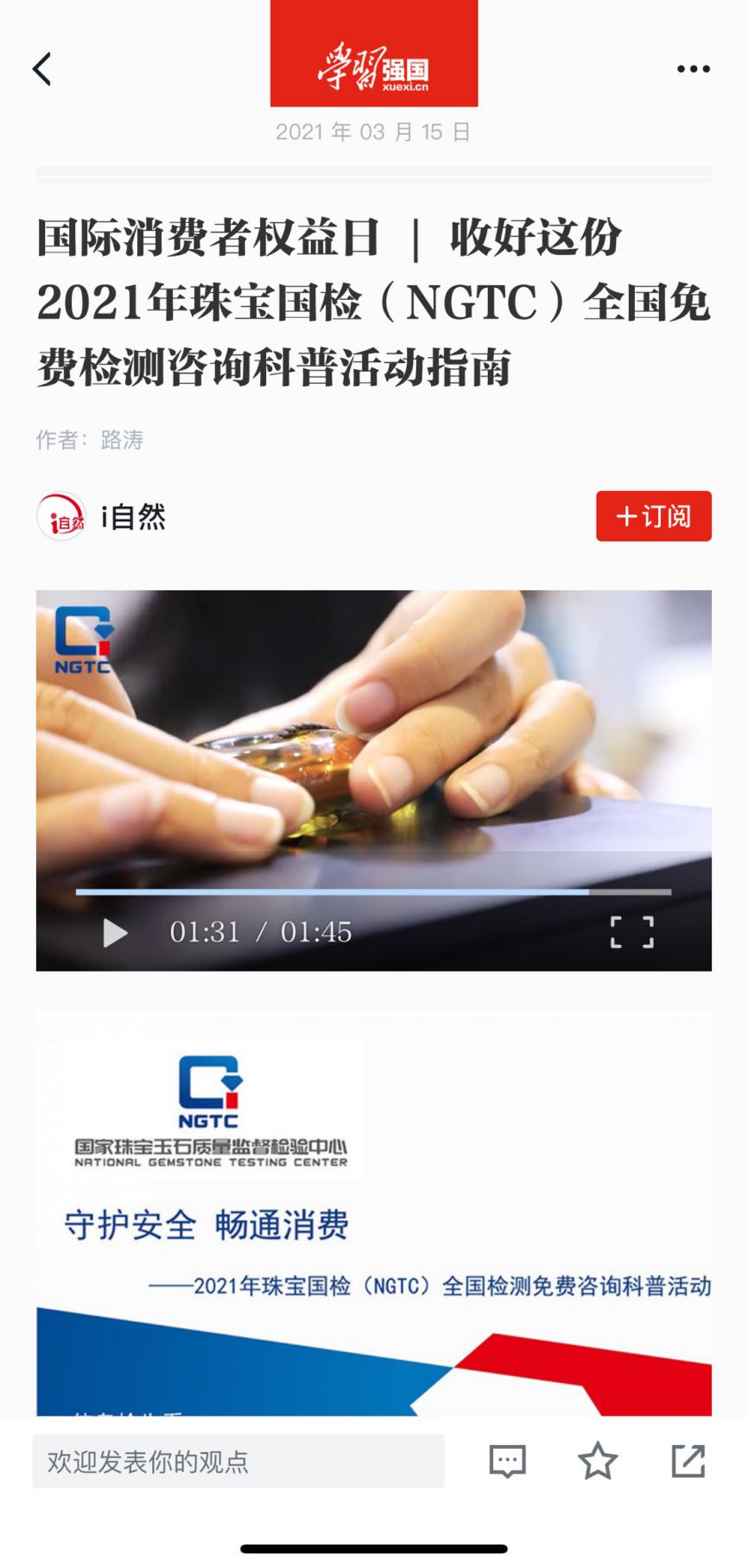 珠宝国检(NGTC)助你维权系列报道(九)丨“3.15NGTC在行动·助你维权”视频片和检测资讯登陆“学习强国”APP!