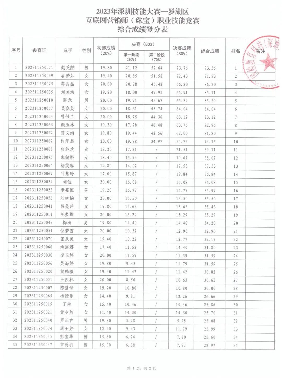 根据《罗湖区互联网营销师(珠宝)职业技能竞赛方案》要求,竞赛组委会于2023年12月3日开展罗湖区互联网营销师(珠宝)职业技能竞赛决赛已顺利结束,现将综合成绩及排名公布表予以公示。
