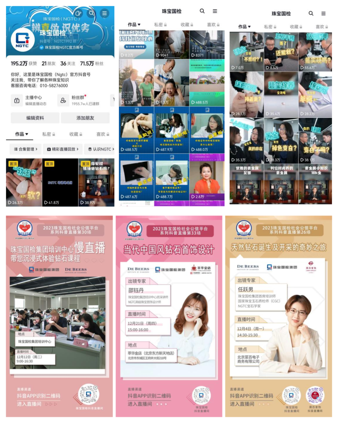自珠宝国检官方抖音账号开通以来,累计播出科普视频285条,视频播放量超3670万次;直播社会公信平台科普活动44场,曝光量超400万次;账号粉丝71.5万人。