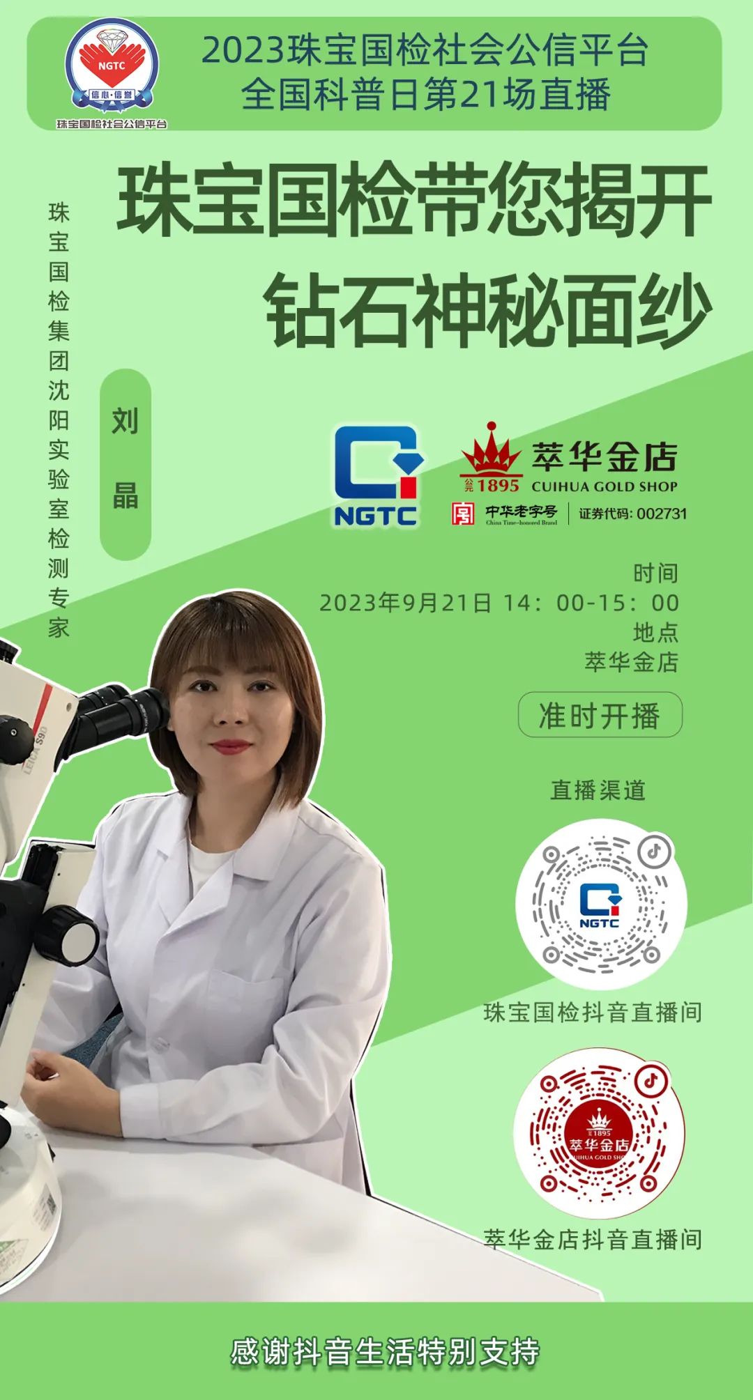 时间:9月21日14:00-15:00 地点:萃华金店 出镜专家:刘晶 直播间:萃华金店抖音直播间 珠宝国检抖音直播间