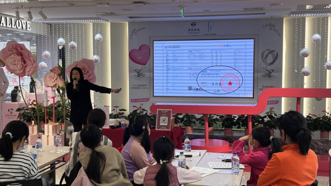 在活动现场,珠宝国检集团高级培训师尹百慧首先向消费者介绍了天然钻石的基本知识,包括天然钻石的成因、分类以及国家标准等,并从珠宝国检钻石分级证书入手解读钻石4C,借助菜百首饰时尚产品让线上线下消费者体验珠宝国检集团研究所最新研发的便携式钻石鉴定仪——PDS I 300的便捷与高效。