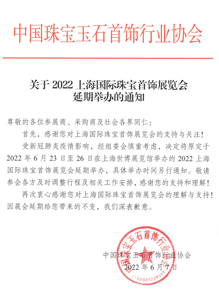 关于2022上海国际珠宝首饰展览会延期举办的通知