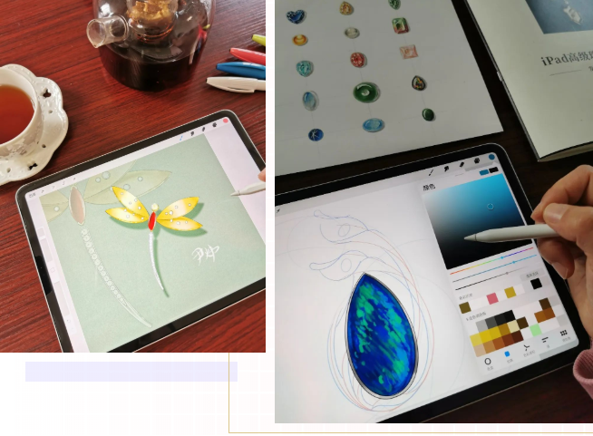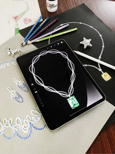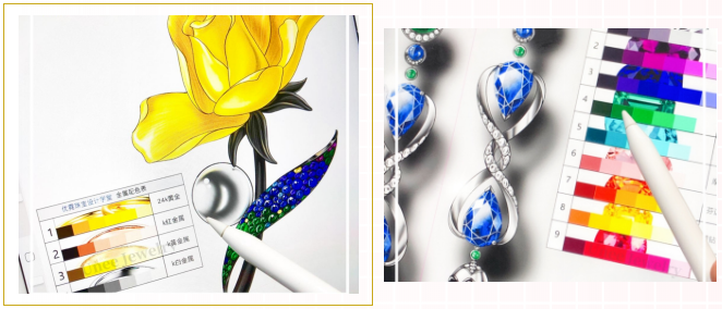 如果说传统一笔一划的手绘更加适用于高级定制珠宝的设计展示,那么iPad(平板电脑)板绘就是一种高效便捷的方式,最大限度保证设计实用性和适配性,提高设计修改速度。
