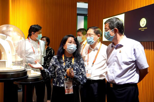 消博会期间,中宝协会长,珠宝玉石首饰国检集团(以下简称:“珠宝国检”)党委书记、董事长叶志斌,中宝协副会长、秘书长毕立君率中宝协与珠宝国检一行到嘉宝阁展厅参观指导。