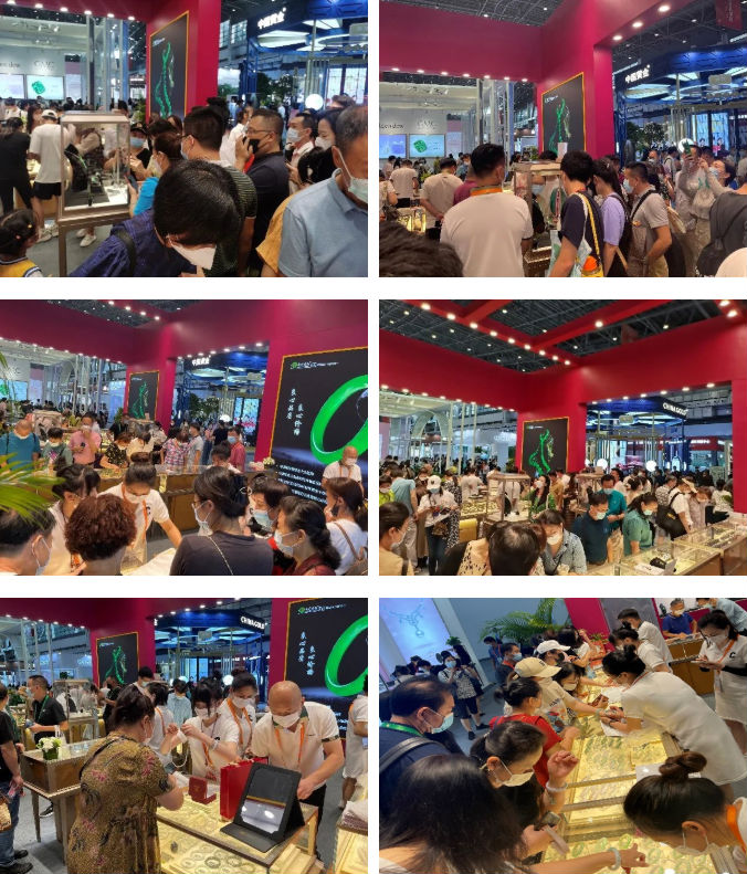 七彩云南翡翠在本次展会上精心展示了上千件精品、新品和玉雕大师作品,品类涵盖了翡翠雕件、手镯、吊坠、镶嵌等,商品总价值约15亿元。展场最为吸睛的还是价值3亿元的镇店之宝—— “绝代风华”翡翠套链,5天展期吸引了大批参观者前来观赏?!八怠薄岸罐⒛昊薄按渎肚逶稀薄熬尽钡若浯渚芬参诵矶圄浯浒谜吣矫袄匆欢梅绮?。