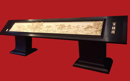 博览会现场即将展示的大型牙雕作品《百骏图》,是运用平雕、透雕、精微雕、线雕等莆田传统牙雕技法并按照清代宫廷画家郎世宁《百骏图》原画作一比一进行再创作的作品。百匹骏马姿势各异,或立、或奔、或跪、或卧,可谓曲尽骏马之态。自2013年12月伊始,宋春国带领团队夜以继日,历时近4年完成此作。(本作品总重量达500公斤,长4.8米、高0.7米)。
