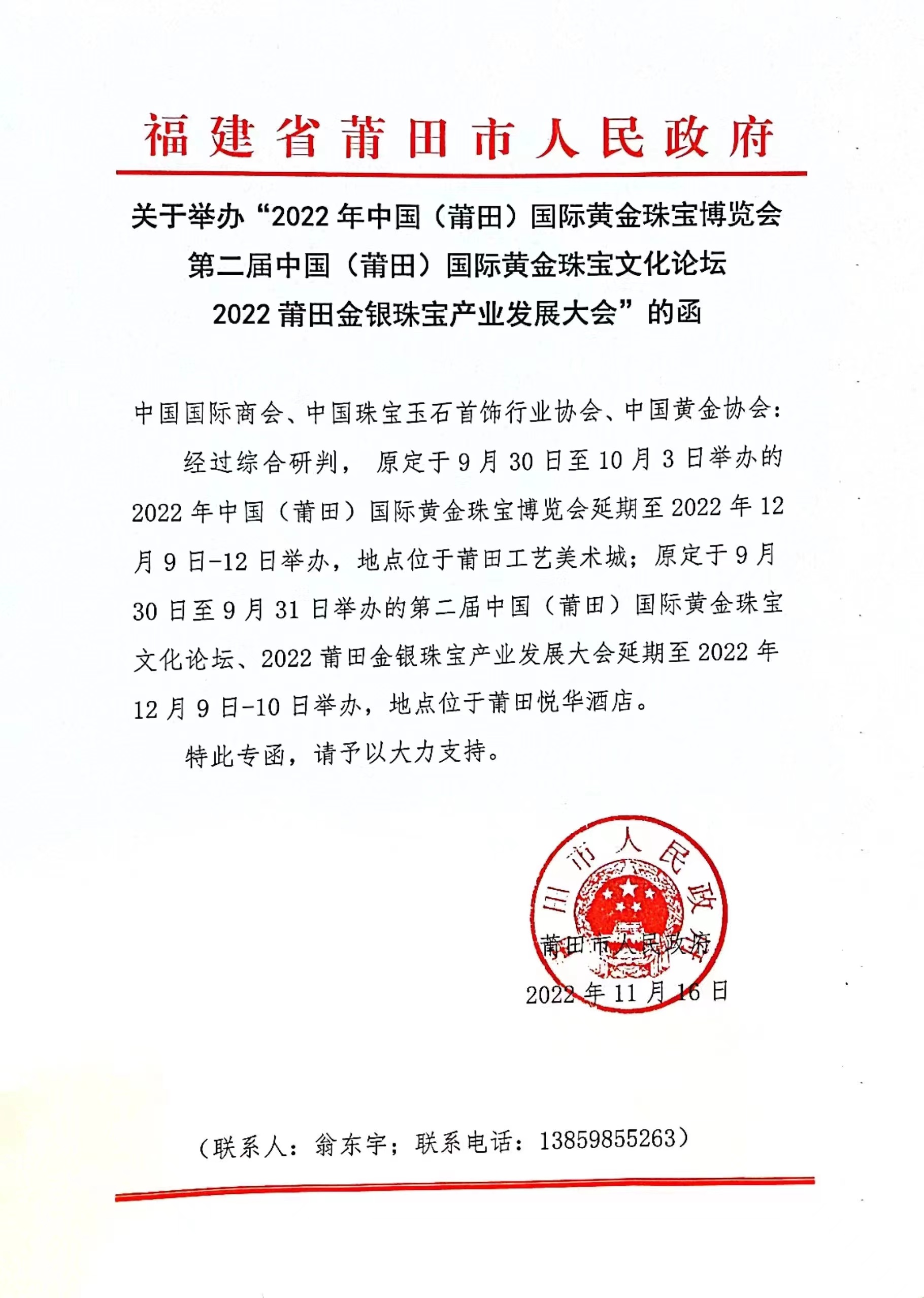 关于举办“2022年中国(莆田)国际黄金珠宝博览会”的通知