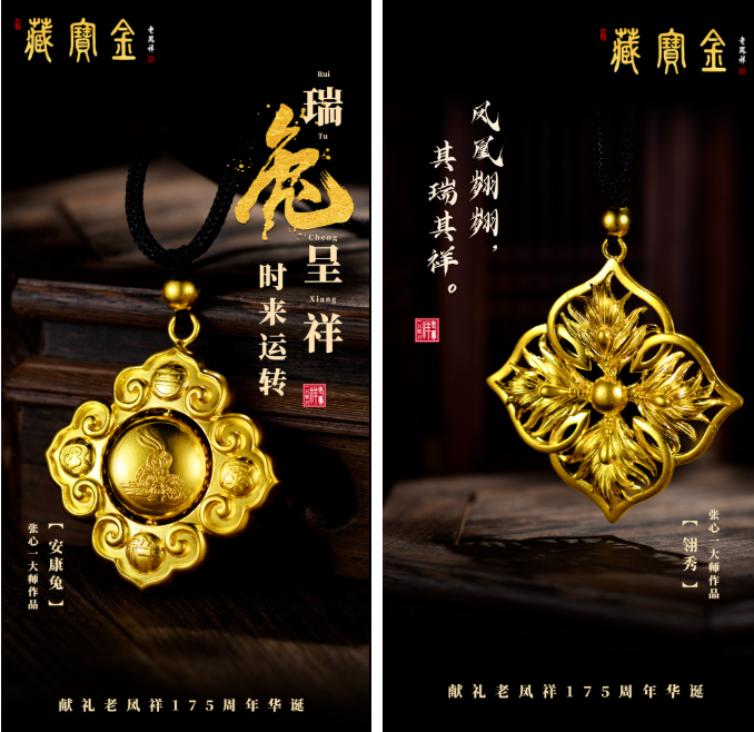 “藏宝金”是老凤祥贵金属制品中典藏级高端精品的总称。老凤祥“藏宝金”源于古代皇室宫廷文化,经过不断传承创新,发展至今。该系列产品是以老凤祥所获得的国家级非物质文化遗产代表性项目名录“金银细工制作技艺”为基础,并结合现代新工艺所精心制作的首饰、器皿、掐丝珐琅制品、手编花丝等系列产品,具有高度的美学艺术鉴赏价值和传承价值。中国工艺美术大师张心一献礼老凤祥175周年华诞的新力作——《安康兔》与《翎秀》,用独特的首饰语言展现了中国传统文化精髓,传递美好祝福。