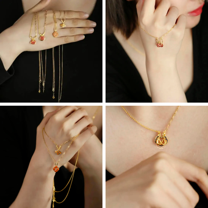 《兔年图什么》是第六届招金设计大赛“生肖设计大奖”的获奖作品,由设计师陆靖婷设计。该系列产品将兔子与平安锁、双钱结、葫芦等中国传统文化元素相融合,并使用珐琅配色,通过生肖兔与国潮文化的碰撞,传达对美好生活的追求与向往。