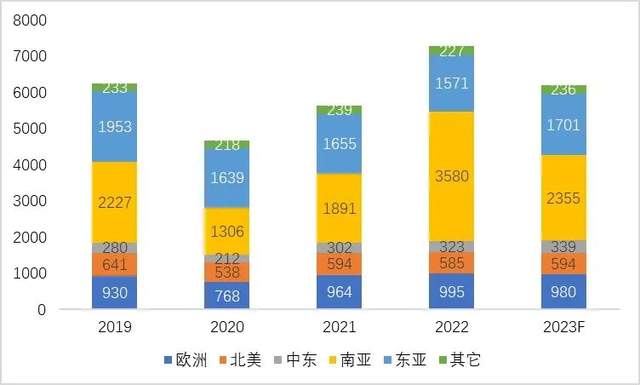 图1 2019—2023年国际各区域银饰用银量(吨)