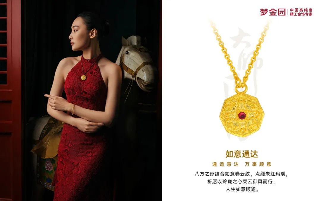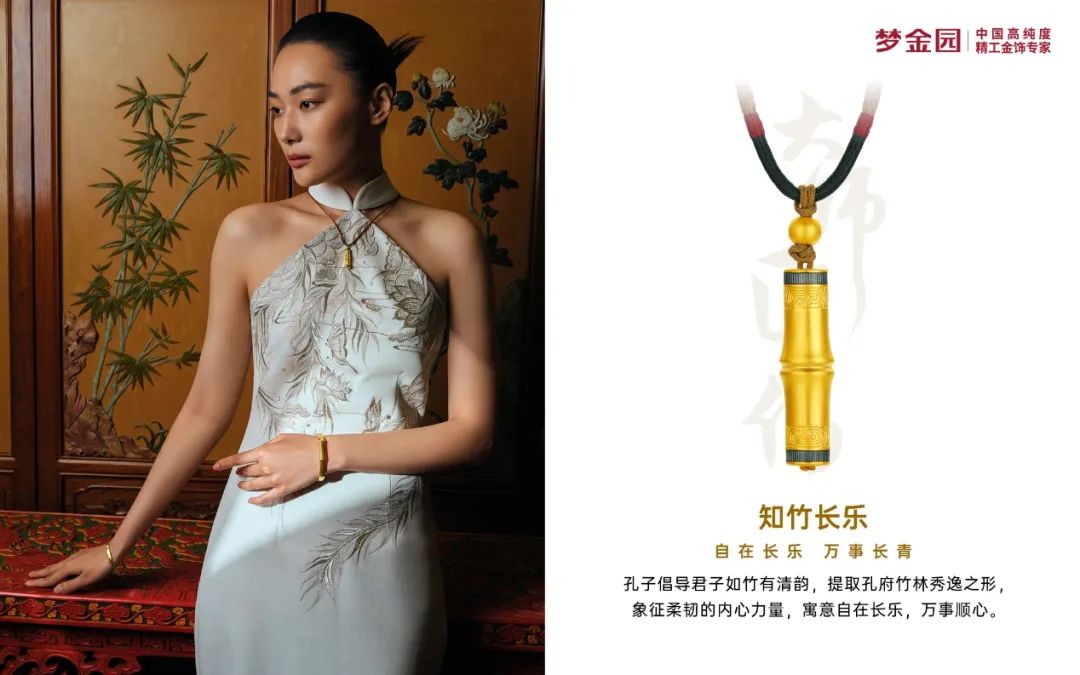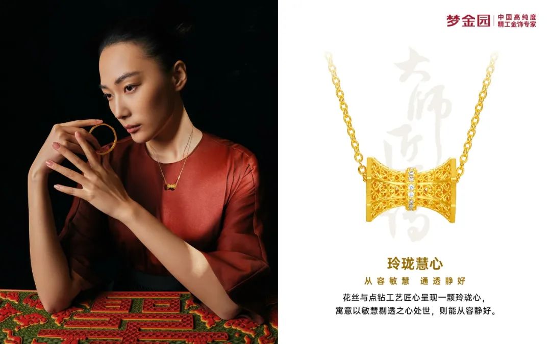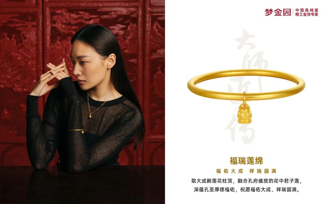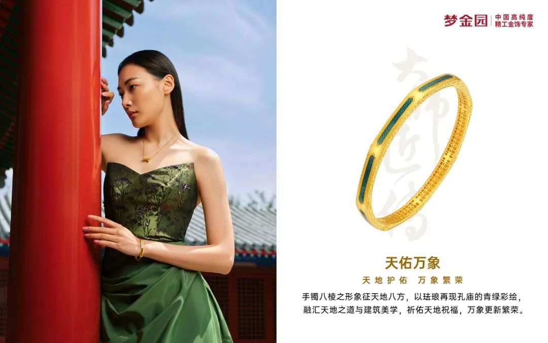 当日,梦金园黄金珠宝品牌代言人江疏影佩戴“大师匠传”系列黄金饰品——“玲珑慧心”项链、耳饰,搭配“天佑万象”手镯亮相,诠释经典优雅与现代时尚。据介绍,这套金饰设计灵感源自孔庙大成殿的八棱石柱,采用千年非遗技艺——花丝与点钻工艺匠制,同时通过珐琅工艺再现孔庙的青绿彩绘,既表达了对于岁月静好的探寻,又祈佑万象更新的繁荣。