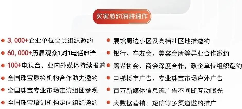 作为国内三大珠宝展之一的中国国际珠宝展已连续成功举办20多年,汇聚珠宝行业上下游优秀制造业、批发商、零售商,打造集市场化、国际化、专业化、信息化为一体的多功能复合型展会,是国内外珠宝企业品牌宣传推广、商贸洽谈、交易的主要场所,更是珠宝企业家、设计师、鉴定师、雕刻师等业内专业人士共话趋势、寻求合作与发展的重要平台。